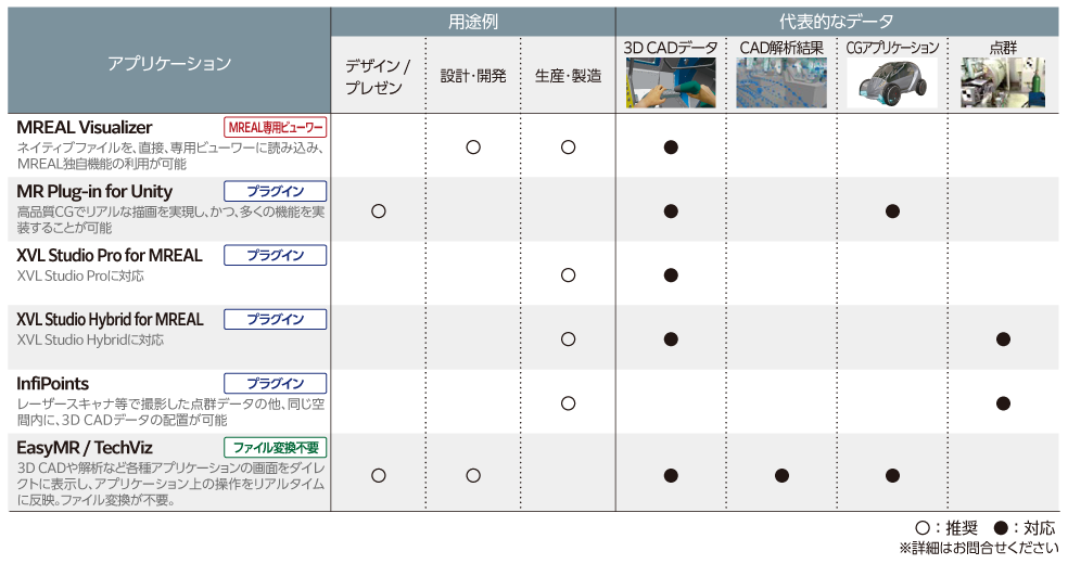 MREALの表示には現実空間にCGを表示するためのMREAL対応アプリケーションソフトウェアが必要です。キヤノン製のMREAL専用アプリケーションに加え、各種3D-CADや3Dソフトウェアに対応可能なアプリケーションラインナップをそろえております。