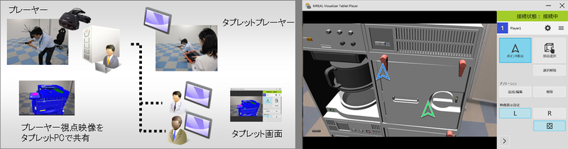 タブレットPCにタブレットプレーヤーを入れることで、プレーヤーの映像をタブレットPCで確認することが可能になります。 タブレットPCからMREAL体験者に指示を与えることも可能です。