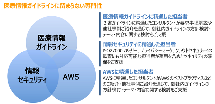 主要メンバーには、医療情報システム監査人補、公認情報セキュリティ監査人、ISMS審査員補、ISO/IEC27017 クラウドセキュリティ審査員などの医療・情報セキュリティ関連の資格保有者および、AWS Certified Solution Architect – ProfessionalなどのAWS認定資格保有者がおります。医療・セキュリティとシステム現場の視点からご支援いたします。