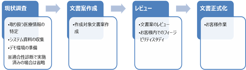 3省2ガイドラインでは、クラウドサービスなどのサービス事業者が医療機関に対し、サービス提供を行う際に、安全管理対策などの実施内容について医療機関へ提示・合意することが求められます。特に総務省ガイドラインでは、以下の文書の作成が求められています。本サービスでは、これら作成が必要な文書のひな型提供およびドラフト版作成をご支援します。