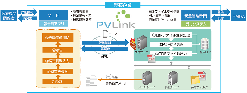 - 「PVLink Camera Report」は、製薬企業とPMDA(独立行政企業医薬品医療機器総合機構)間で行われている医薬品の副作用等の報告業務(以下 副作用報告)を円滑に行う事をサポートするシステムです。製薬企業のMR(医薬情報担当者)が、医療機関から収集した紙ベースの医薬品の副作用・症例情報をスマートデバイスのカメラで電子化し、自社の安全管理部門に迅速かつセキュアに報告が実現できます。また、汎用撮影モードにより医療機器の不具合報告にも対応しています。